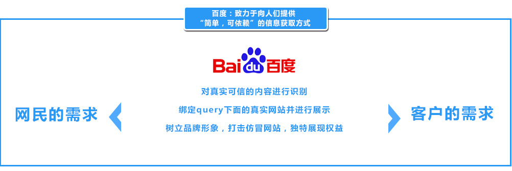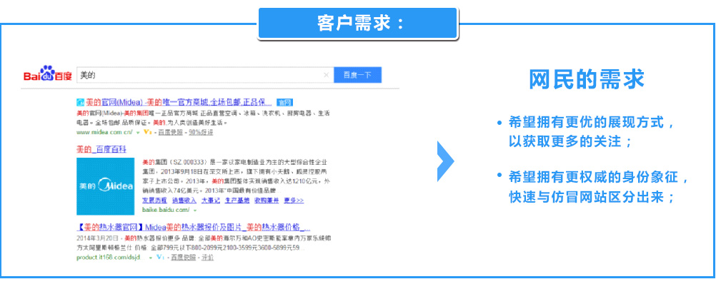 百度官网认证(标准版)产品背景百度如何解决企业官网需求什么是百度官网认证标准版百度官网认证标准版是指:当网民通过百度搜索平台搜索特定query词时(标准版官网词由系统推荐,准确匹配),所触发的自然搜索结果中,对“该query词与所属主体且对应的官方网站”展示官网标识,以防止山寨、钓鱼网站对客户及网民的侵