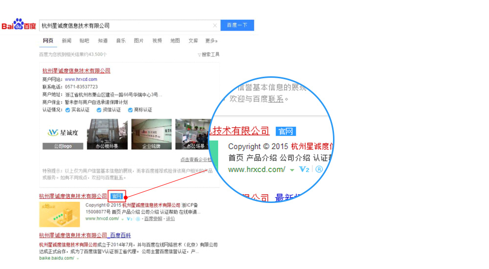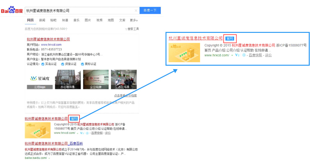 展现触发机制:网民通过百度搜索,准确检索关键词(官网触发词),只要通过官网认证标准版的网址出现在搜索结果中,就会展现蓝色官网标识;